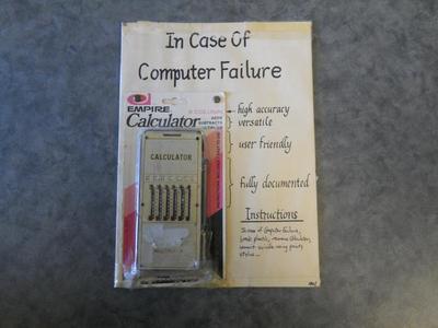 This Empire 6 Column calculator seems to have been purchased and displayed as a joke. The device is affixed to a piece of cardboard which reads "In case of computer failure" "High accuracy" "user friendly" "fully documented" and "Instructions, In case of computer failure break plastic, remove calculator, commit suicide using pointy stylus...".