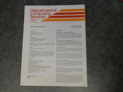 Department of Computer Services Newsletter #54 Issue 1987-02. Contains information regarding using NUI to access Datapac, microcomputer software news, mail update for WATDCS users, project ARIES, printing PCTeX DVI files on UNIX systems, writing tools for script users, using WATFILE/Plus to process class marks, DISSPLA codebook, and Cory Burgener's twenty years in DCS.