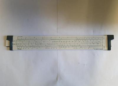 This is a slide rule manufactured in Keuffel & Esser Co. It can be used to perform multiplication, division, square and cube root. Also, sine, cosine and tangent can be done with the slide rule. It has accuracy of two decimal places. Yet, for the third decimal place, it can be found through mental calculation. For accuracy beyond 3 decimal place, you need to perform physical calculation on a paper.