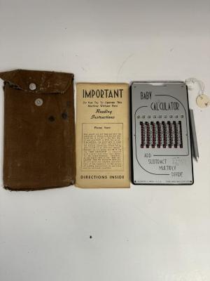 Released in 1947, the adding machine pictured was version three of the Baby Calculator, which began production in 1923. The Baby Calculator is in a snap button brown suede bag with use instructions inside.