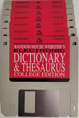 Set of 7 Random House Webster's Electronic Dictionary & Thesaurus College Edition for Windows 3.5" floppy disks. Published by WordPerfect in 1994.