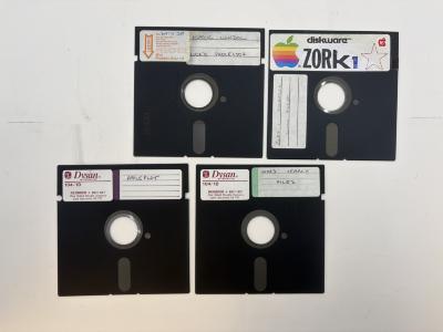 Variation of 4 floppy disks. Including Magic window word processor, Apple plot, Word Search files and Zork 1 game.